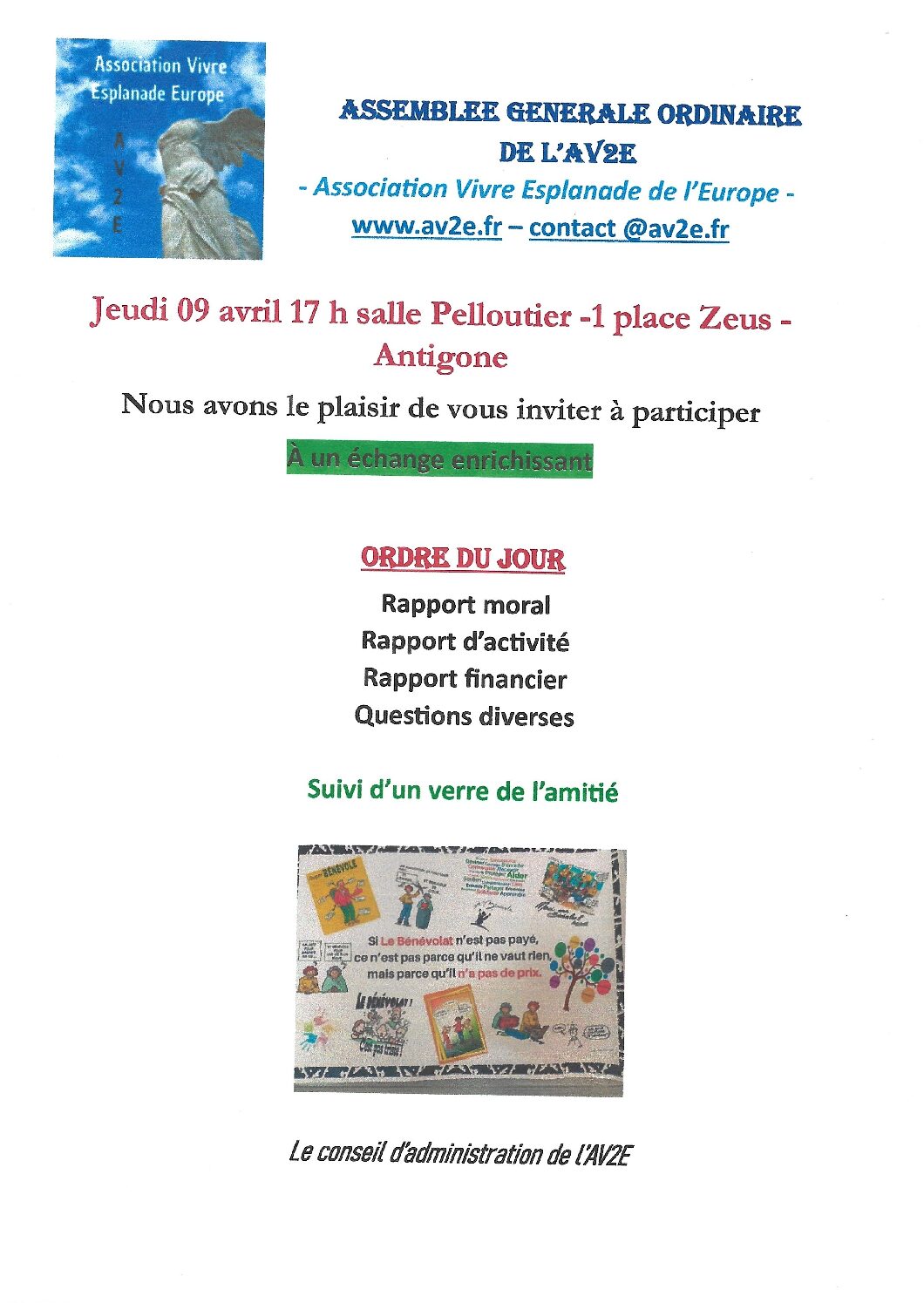Assemblée Générale AV2E : jeudi 09 avril 2026 – 17h – salle Pelloutier – Antigone : ordre du jour
