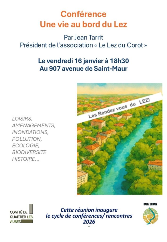 Vendredi 16 janvier 2026 – 18h 30 – 907 avenue ST – Maur – le Comité de Quartier des Aubes vous propose un cycle de conférences sur le Lez.Le Lez traverse notre quartier, il contribue à son identité et à notre qualité de vie;Cette première conférence présentera notre fleuve, son histoire, son patrimoine et son évolution depuis la moitié du siècle dernier.D’autres rencontres suivront, au cours desquelles des scientifiques vous exposeront les enjeux (écologie, prévention des risques …) liés au Lez.Venez nombreux!